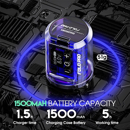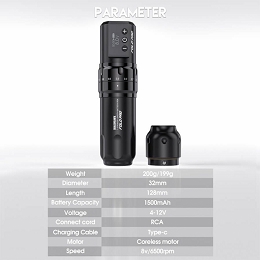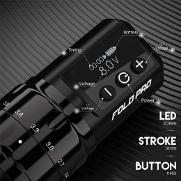 La batería de gran potencia tiene una capacidad de 1500mAh, con la gama de longitudes de carrera y la función de arranque instantáneo que permite todas las técnicas de tatuaje, estilos, e incluso las configuraciones de cartucho más duras. La Fold Pro tiene un rango de voltaje de trabajo de 4-12 V, con una batería que dura de 4 a 6 horas a partir de una hora y media de carga a través de USB-C.