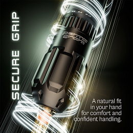 La libertad total sin cables viene de serie. Equaliser Pentagram está equipado con dos baterías reemplazables que proporcionan hasta 12 horas de funcionamiento ininterrumpido. Energía suficiente para sesiones largas, sesiones especiales o convenciones. A la hora de cargar, de 2 a 3 horas bastan para que la máquina esté completamente operativa. Su delgada carcasa de aluminio y su diseño equilibrado garantizan un agarre seguro y un uso cómodo durante todo el día. Este equipo satisfará las expectativas de los tatuadores más exigentes.