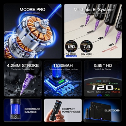 - Potente mejora del rendimiento: Equipada con el motor MCORE Pro evolucionado, ofrece un 40 % más de fuerza de penetración, asegurando un trabajo más fluido y rápido en todos los estilos de tatuaje.